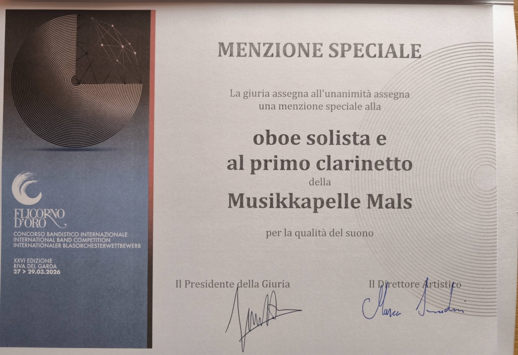 Ebenso bedankt sich die Musikkapelle Mals beim Amt für Kultur der Autonomen Provinz Bozen für den mit Dekret Nr. 2891/43/2025 gewährten Investitionsbeitrag in Höhe von 13.180,00 Euro.